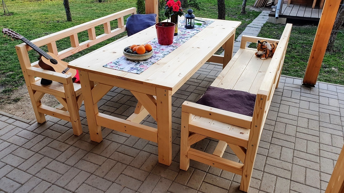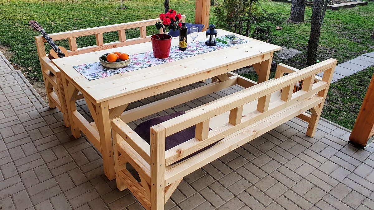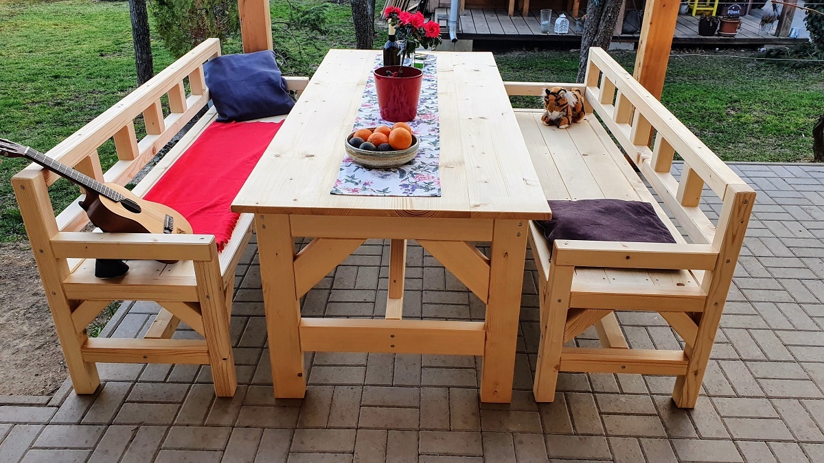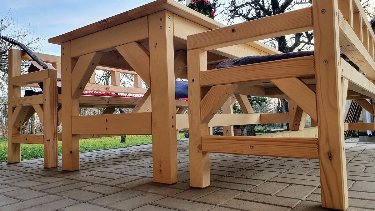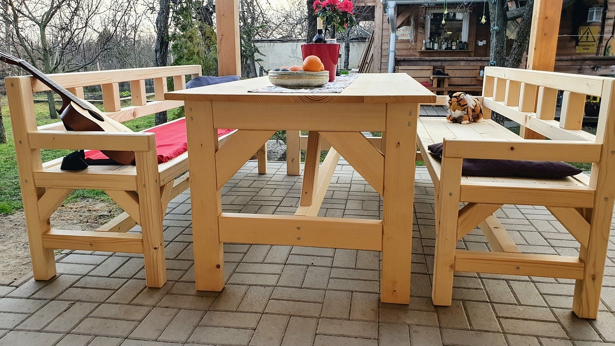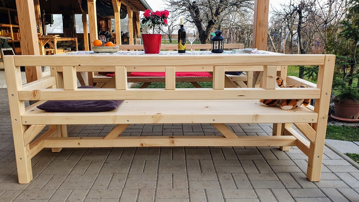 Súprava chalupárskeho sedenia 1 x stôl a 2 x lavica zo smrekového dreva. Povrchovo upravené polomatným transparentným olejom OSMO.