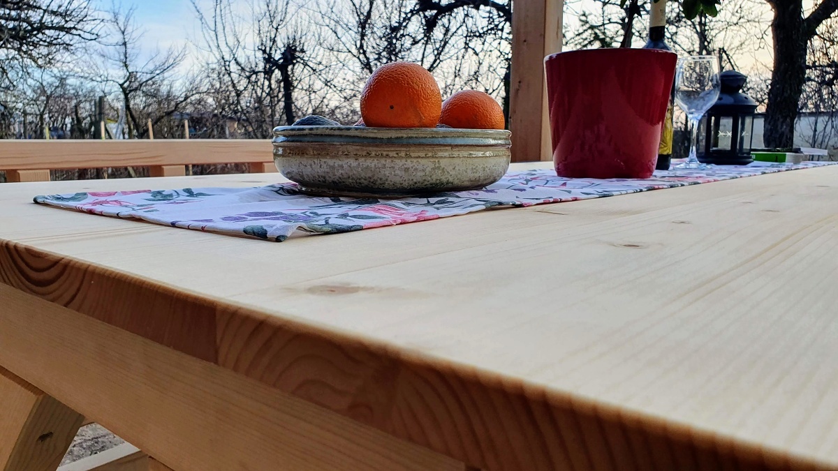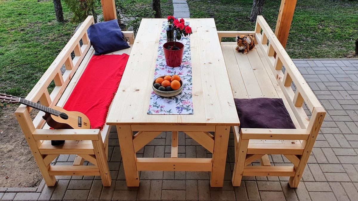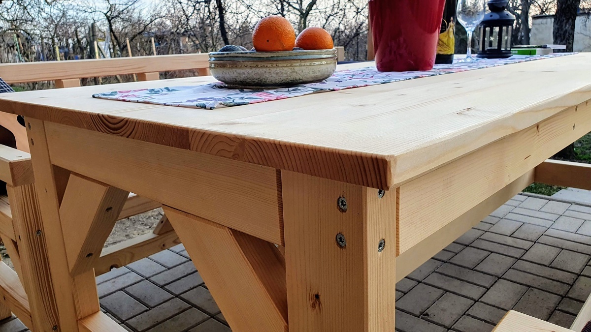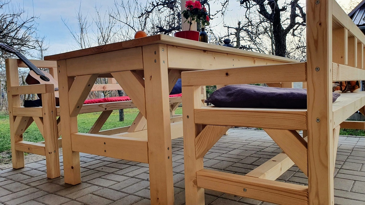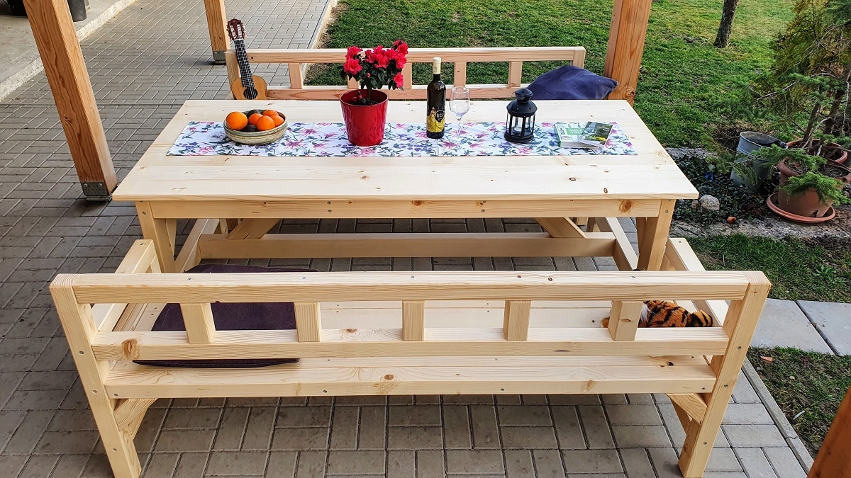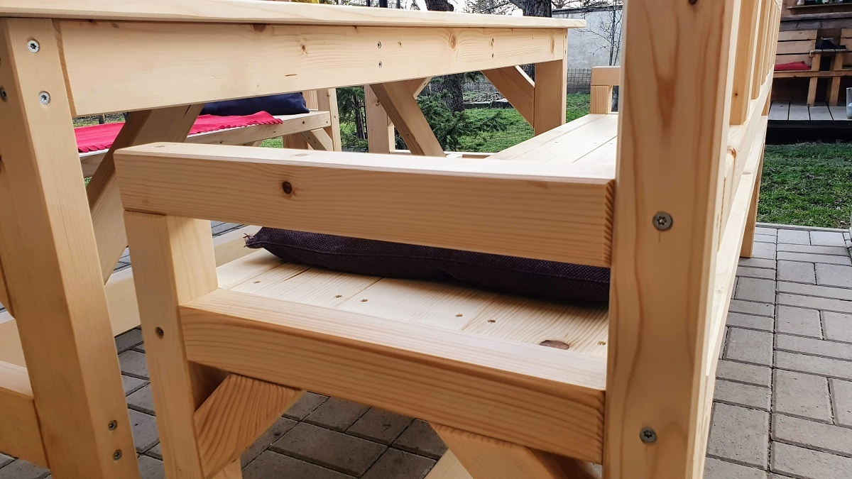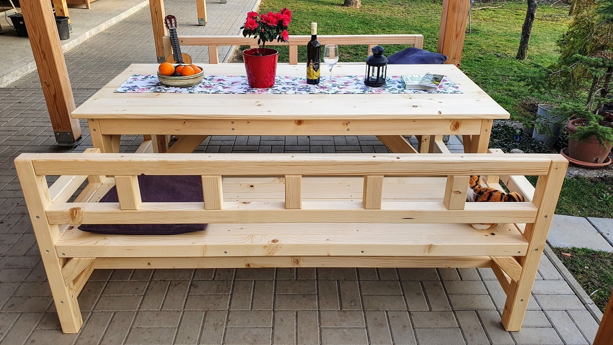 Súprava chalupárskeho sedenia 1 x stôl a 2 x lavica zo smrekového dreva. Povrchovo upravené polomatným transparentným olejom OSMO.